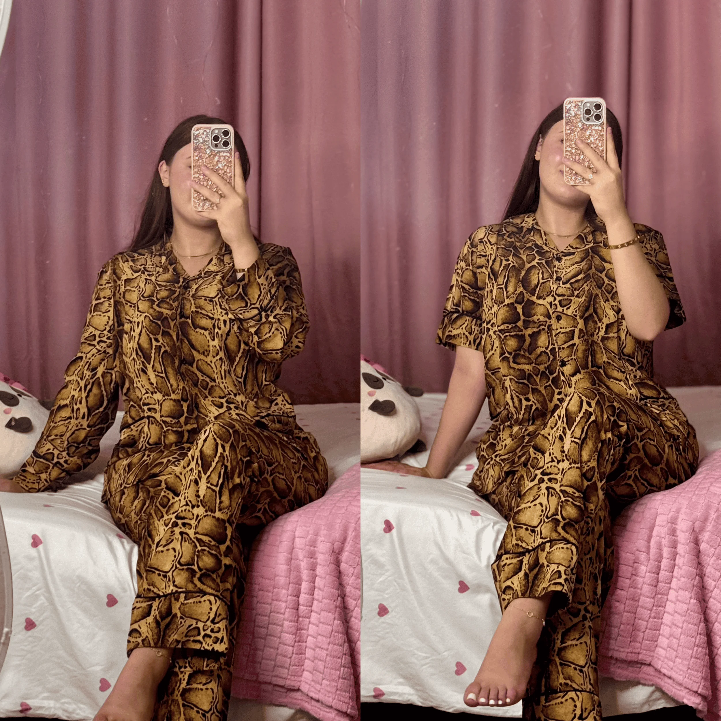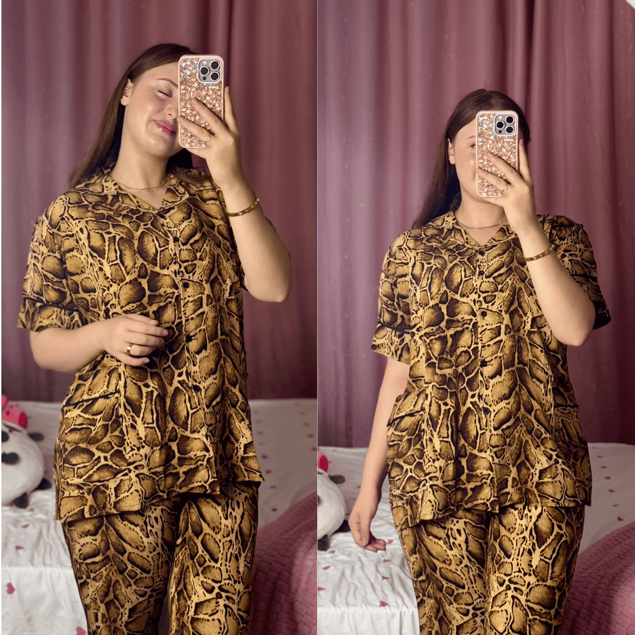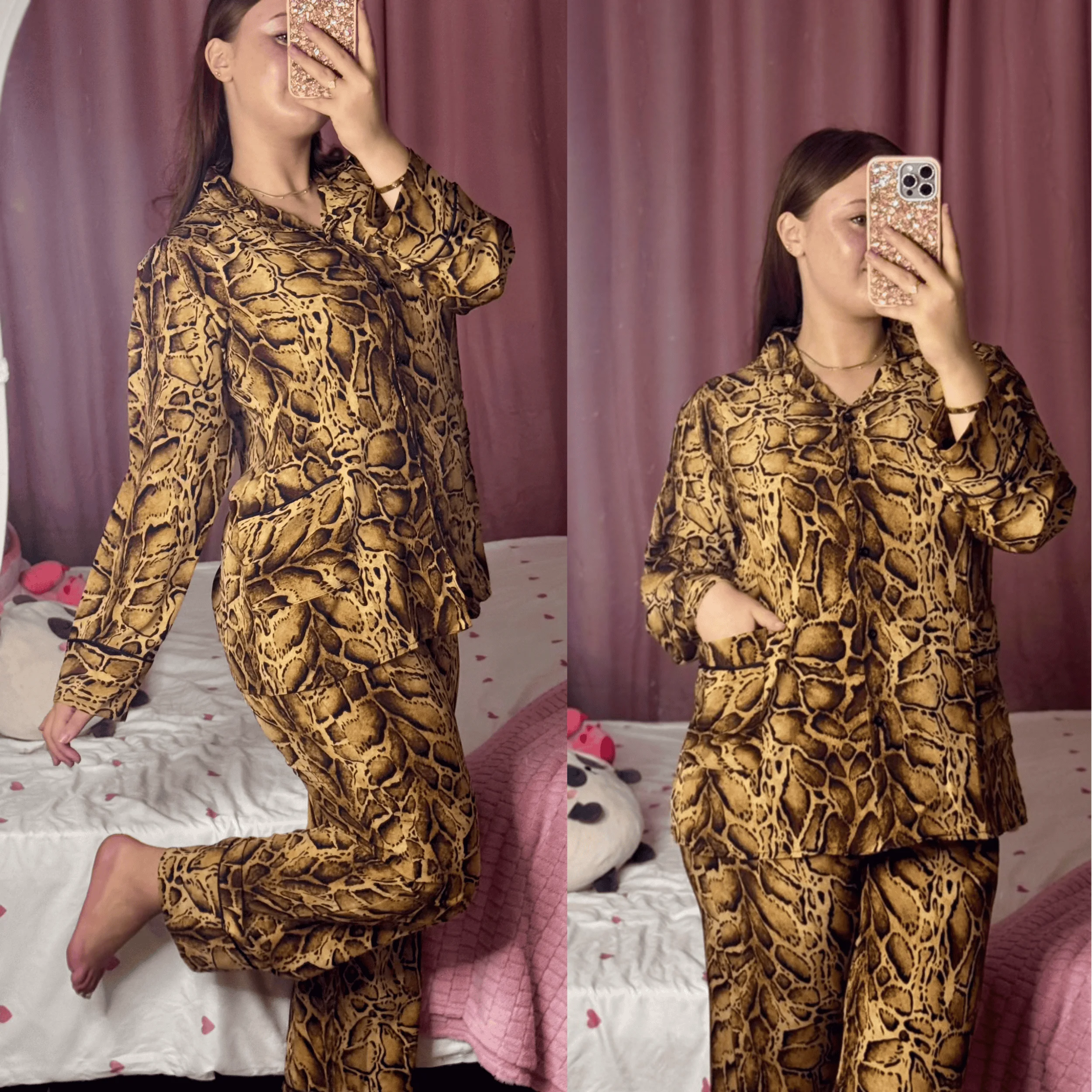 تم تصميم تايغر بيجامة لتكون رفيقتكِ داخل المنزل 🌙 تصميم عصري بنقشة تايغر أنيقة قَصّة مريحة تناسب جميع الأذواق مقاسات من S حتى 3XL تمنحكِ إحساسًا بالراحة والثقة في كل وقت 🐯